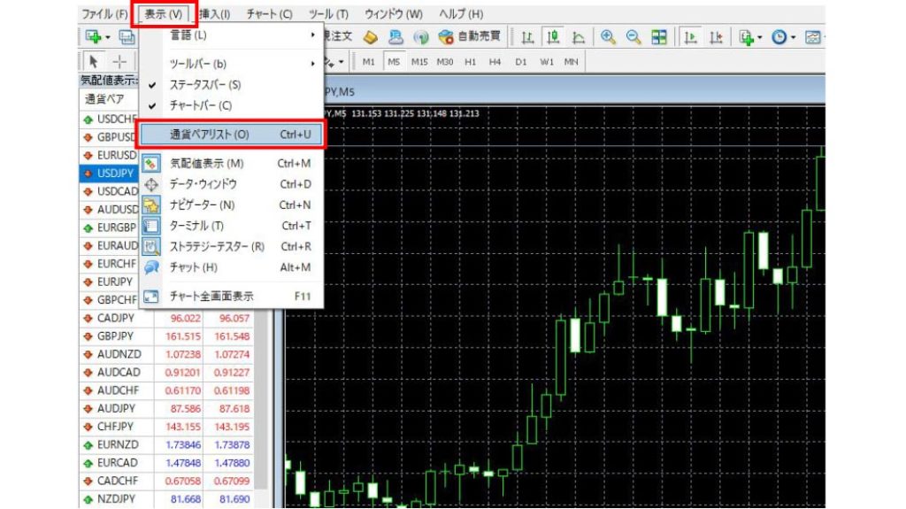 「表示」→「通貨ペアリスト」をクリックしてください。