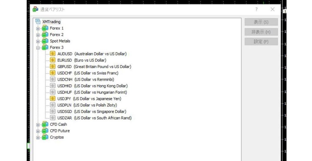 表示していない通貨ペアを探しクリックすると$マークが黄色に変わるのを確認し「OK」をクリック