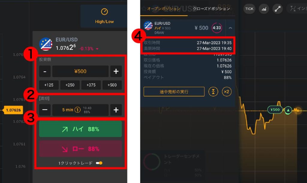 03の赤丸:矢印が上に向いている場合「ハイ」でエントリー後相場が逆に動きその後再度エントリー