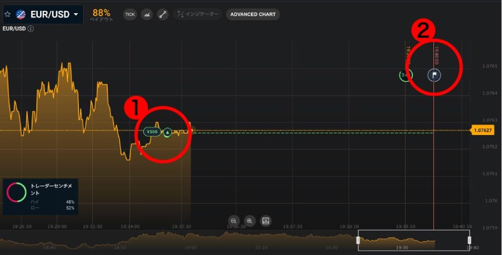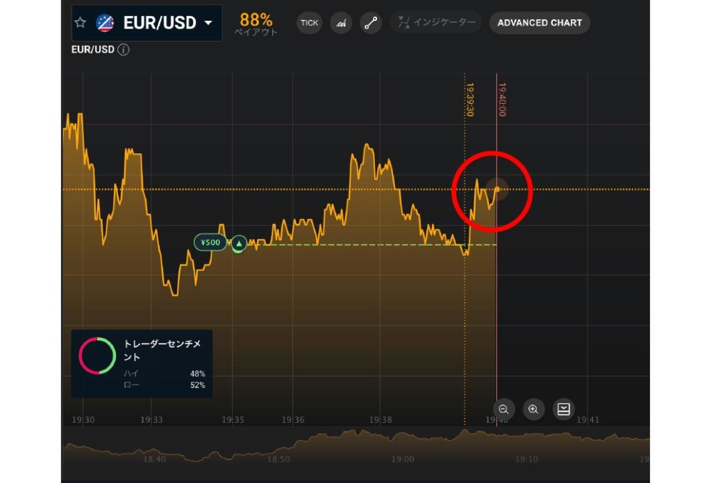 ④19:30から始まったローソク足が19:35に矢印がハイに成形されたので19:35エントリー|満期時間は19:40
