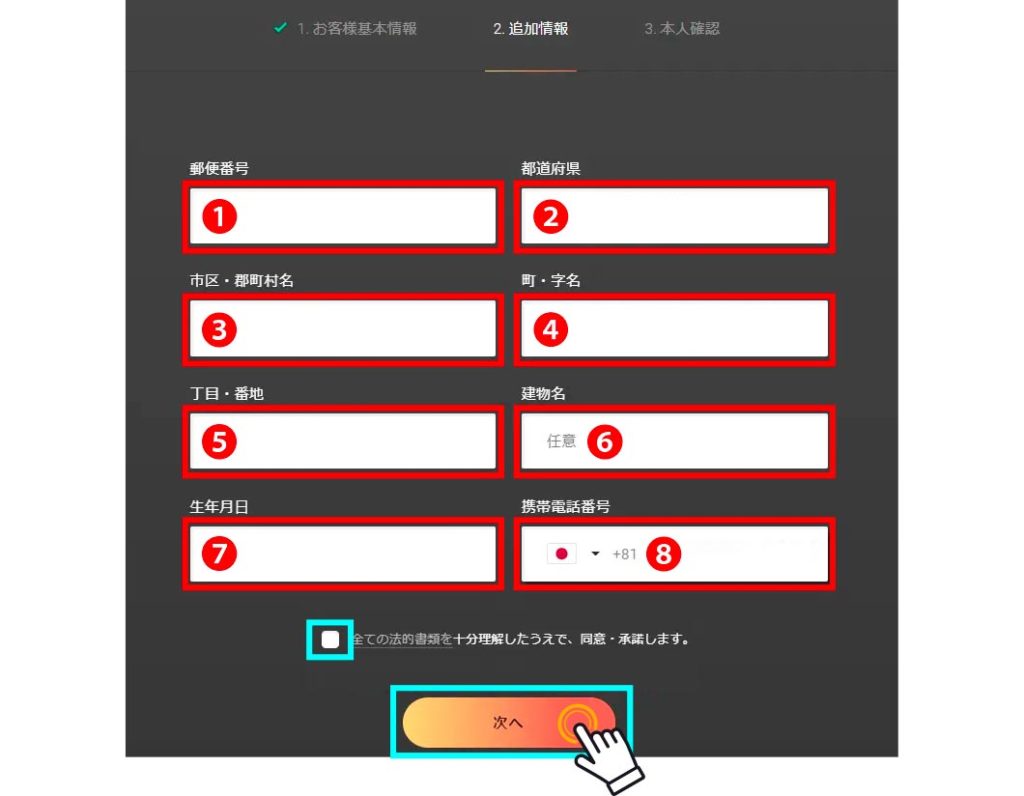 入力できたら「すべての法的書類を十分理解したうえで、同意・承諾します」にチェックを入れて「次へ」をクリックします。