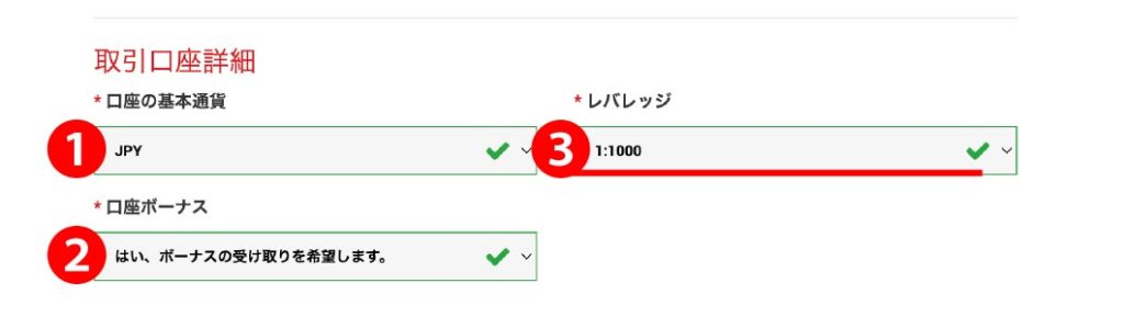 | 3.レバレッジ | 1:1000を選択して下さい。(レバレッジは口座開設後変更できます) |