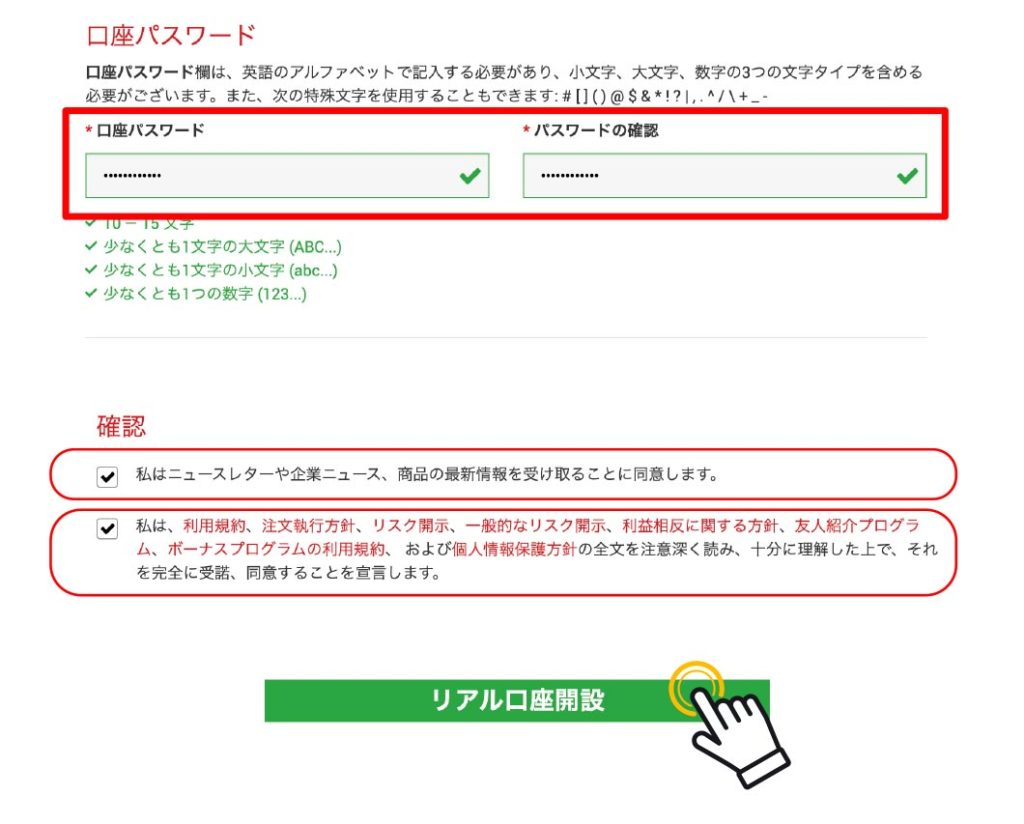 最後に利用事項を確認しチェックをした後「リアル口座開設」ボタンをクリック。