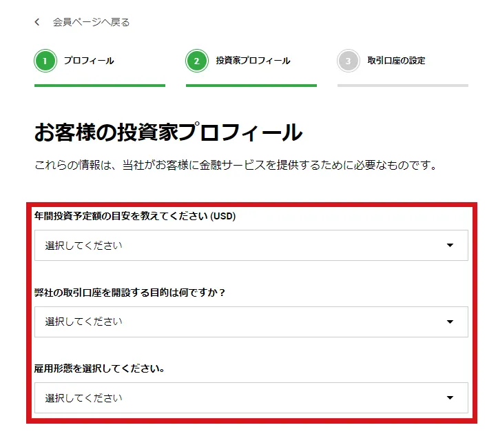 | 取引の目的 | 投資:取引目的を選択 |