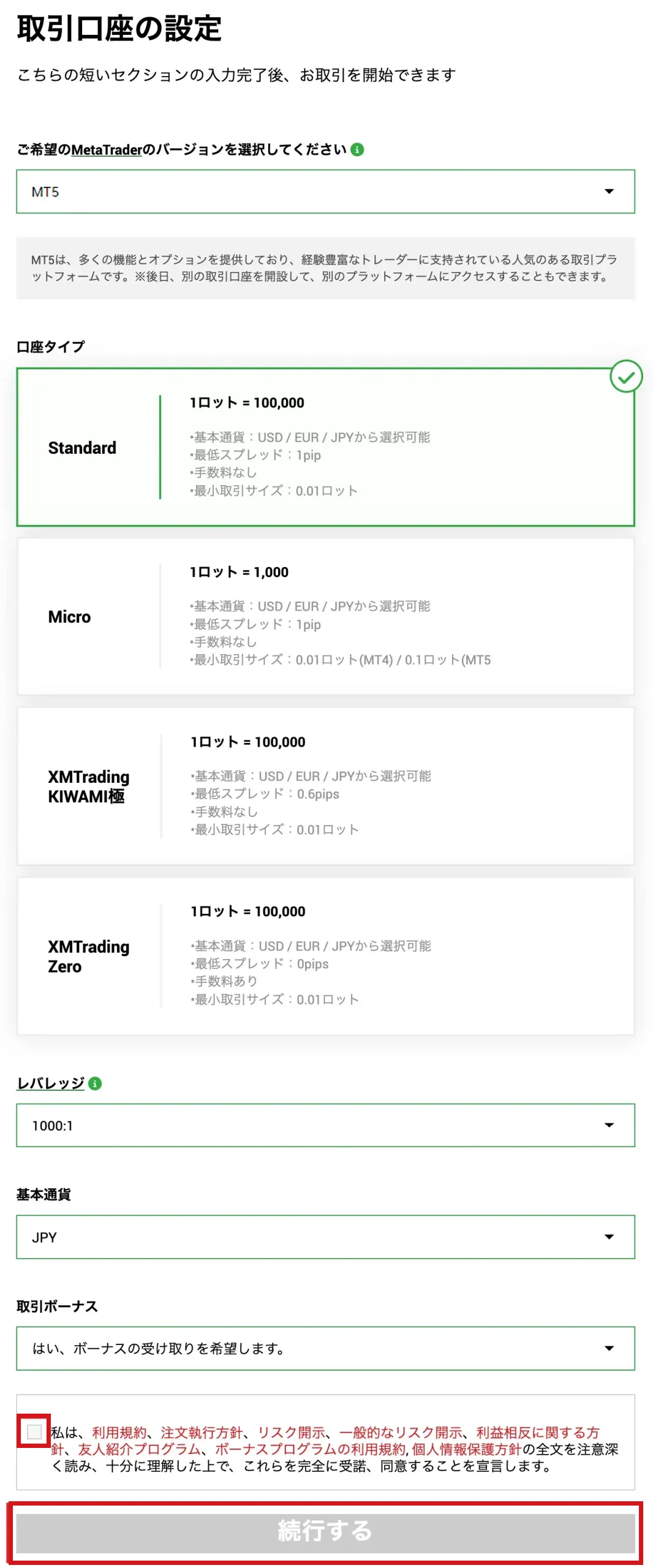 | 口座タイプ | Standard口座を選択(全てのボーナス獲得が可能) |