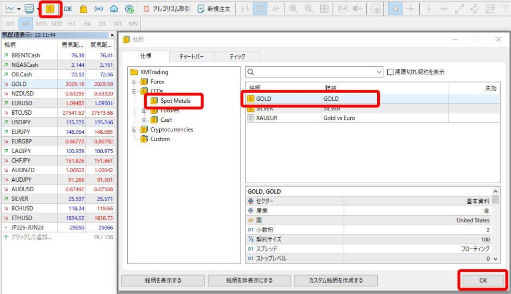 表示していない通貨ペアを探しクリックすると$マークが黄色に変わるのを確認し「OK」をクリック