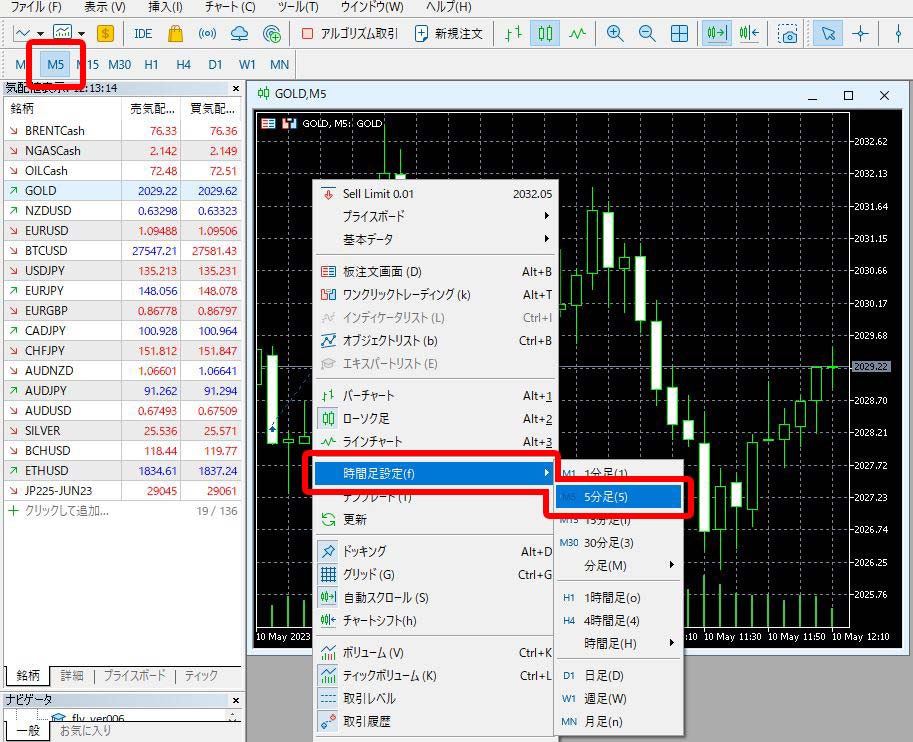 チャート上で右クリックで時間足設定でも設定できます。